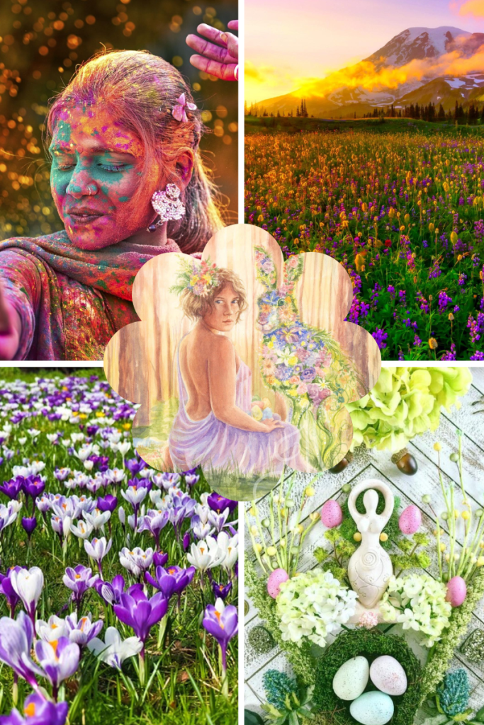 Chez les anglos-saxons, Eostre, déesse de la fertilité et de l’abondance transforma un jour en lièvre, l’oiseau qui l’accompagnait. On célébrait alors la déesse par des offrandes d’œufs peints, pour s’assurer la venue du printemps. Les germains célébraient Ostara, les romains Aurore, les baltes Ausra, les grecs Éos et les hindous Ushas.